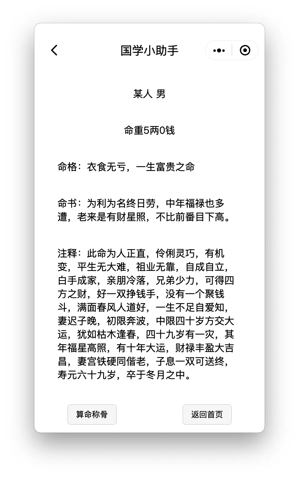 一個人出生的年、月、日、時各有定數,年、月、日、時的重量都有具體規定,只要把年、月、日、時的重量加在一起(稱骨算命是依據農曆/陰曆出生時間計算的),在微信小程序國學小助手中免費稱骨算命中查出出生年的重量、出生月的重量、出生日的重量以及出生時辰的重量,將四個重量相加所得即為八字重量,按照【稱骨歌】一查,就可確定這個人一生的命運。